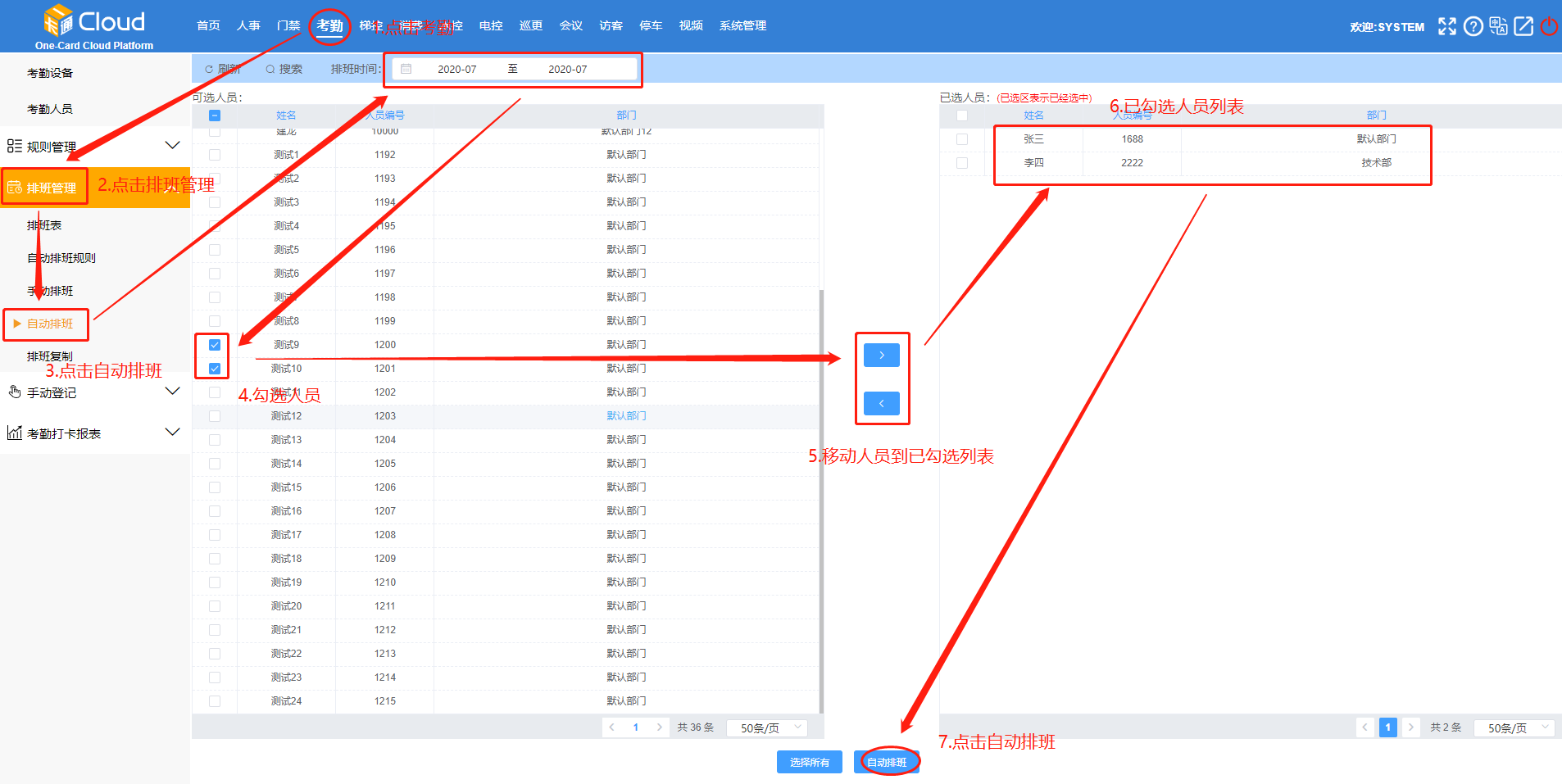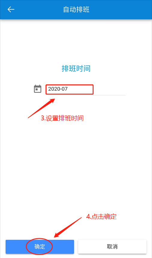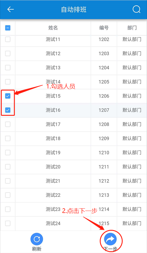 在【自動排班】頁面,勾選人員-點擊【下一步】-設置【排班時間】-點擊【確定】。如下圖所示: