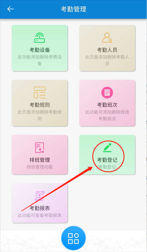 點擊【考勤】-【考勤登記】-【補卡】。如下圖所示: