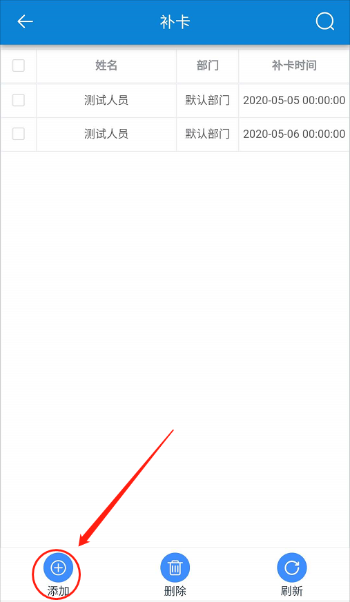 在【補卡】頁面,點擊【添加】-勾選人員-點擊【下一步】-設置【補卡時間、補卡類型、描述】-點擊【確定】。如下圖所示: