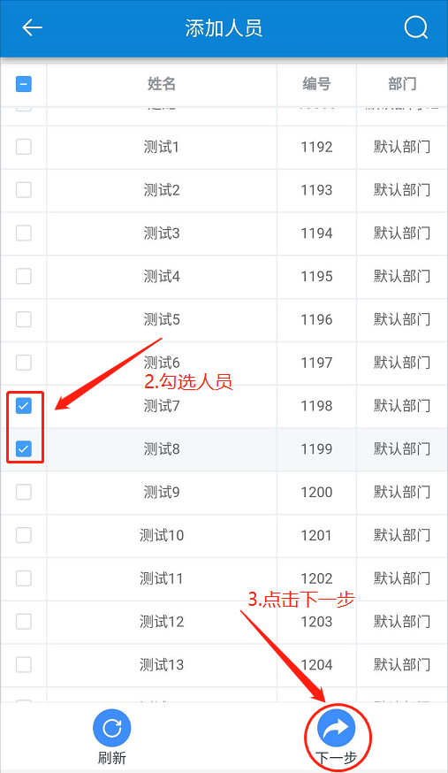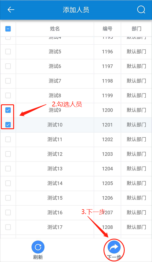 在【請假】頁面,點擊【添加】-勾選人員-點擊【下一步】-設置【請假類型、請假時間、原因】-點擊【確定】。如下圖所示: