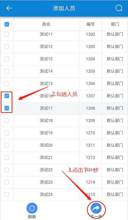 在【加班】頁面,點擊【添加】-勾選人員-點擊【下一步】-設置【加班時間、備注】-點擊【確定】。如下圖所示: