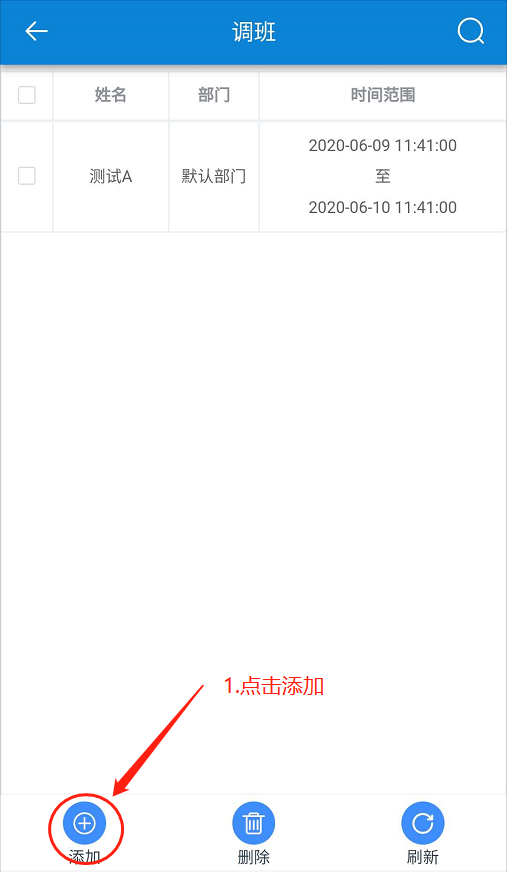 在【調班】頁面,點擊【添加】-勾選人員-點擊【下一步】-設置【調班時間、備注】-點擊【確定】。如下圖所示: