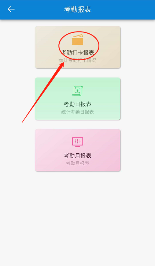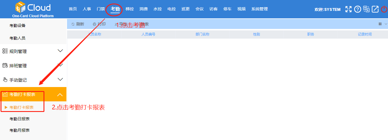 點(diǎn)擊【考勤】-【考勤報(bào)表】-【考勤打卡報(bào)表】。如下圖所示: