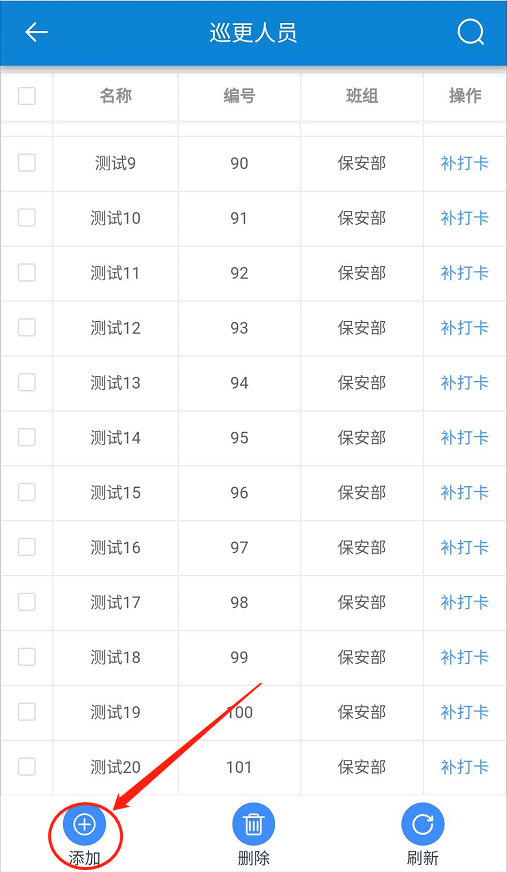 點擊【巡更】-【巡更人員】-【添加】-設置班組,勾選人員-點擊【確定】。如下圖所示: