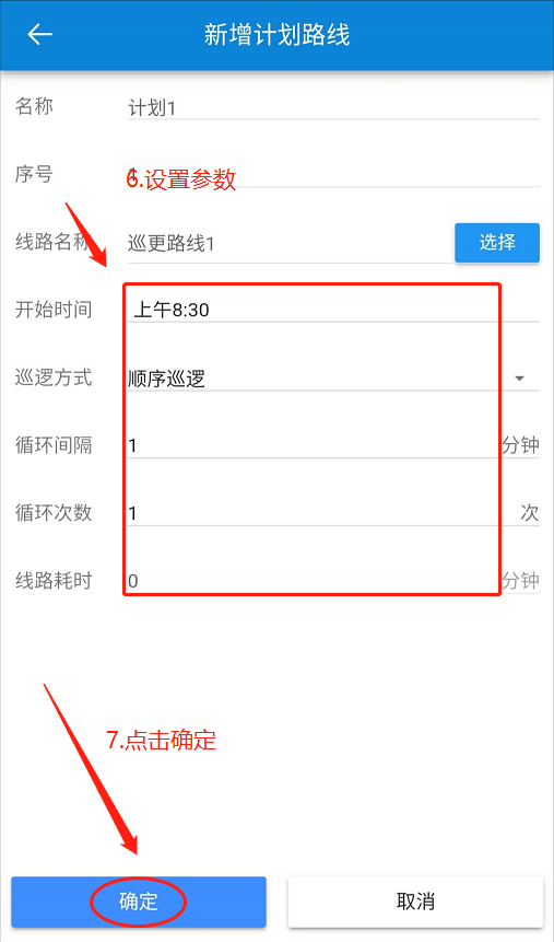 回到【新增計劃路線】頁面,設置開始時間、巡邏方式、循環間隔、循環次數、線路耗時-點擊【確定】進入【巡更計劃選擇】頁面,勾選線路-點擊【確定】。如下圖所示: