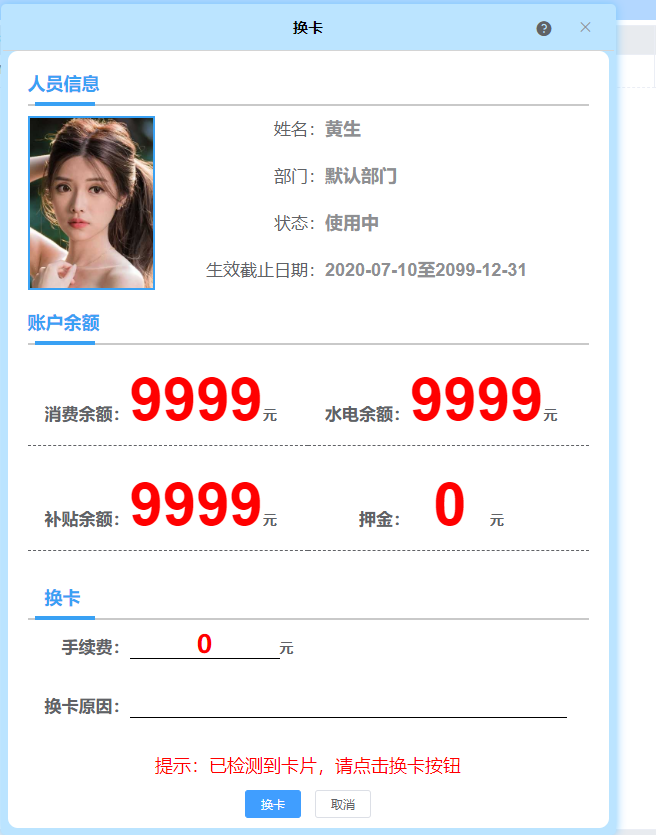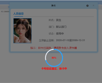 彈出換卡界面,待讀取卡片信息后顯示人員信息